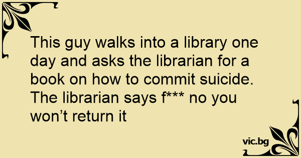 This guy walks into a library one day and asks the librarian for a book on how to commit suicide. The librarian says f*** no you won’t return it