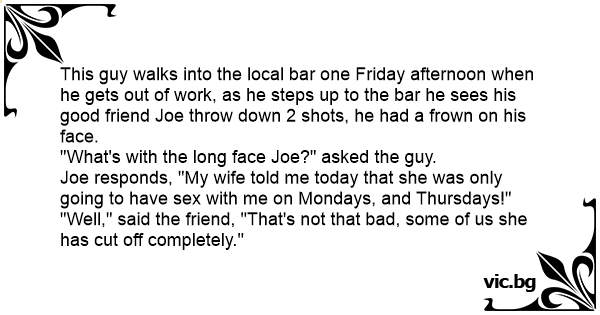 Joe responds, "My wife told me today that she was only going to have sеx with me on Mondays, and Thursdays!"