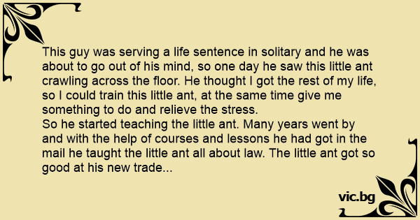 This guy was serving a life sentence in solitary and he was about to go out of his mind, so one day he saw this little ant crawling across the floor. He thought I got the rest of my life, so I could train this little ant, at the same time give me something to do and relieve the stress.