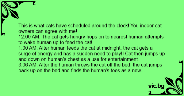 12:00 AM: The cat gets hungry hops on to nearest human attempts to wake human up to feed the cat..................