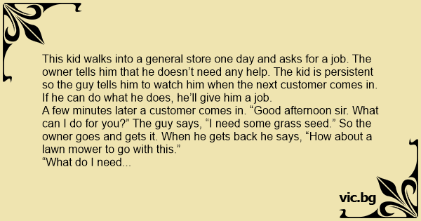 A few minutes later a customer comes in. “Good afternoon sir. What can I do for you?” The guy says, “I need some grass seed.” So the owner goes and gets it. When he gets back he says, “How about a lawn mower to go with this.”