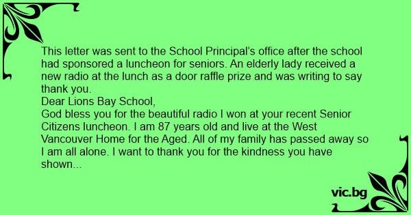 This letter was sent to the School Principal’s office after the school had sponsored a luncheon for seniors. An elderly lady received a new radio at the lunch as a door raffle prize and was writing to say thank you.