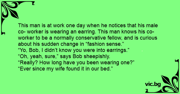 This man is at work one day when he notices that his male co- worker is wearing an earring. This man knows his co-worker to be a normally conservative fellow, and is curious about his sudden change in “fashion sense.”
