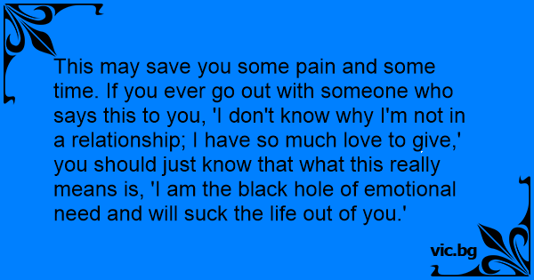 This may save you some pain and some time. If you ever go out with someone who says this to you, 'I don't know why I'm not in a relationship; I have so much love to give,' you should just know that what this really means is, 'I am the black hole of emotional need and will suск the life out of you.'