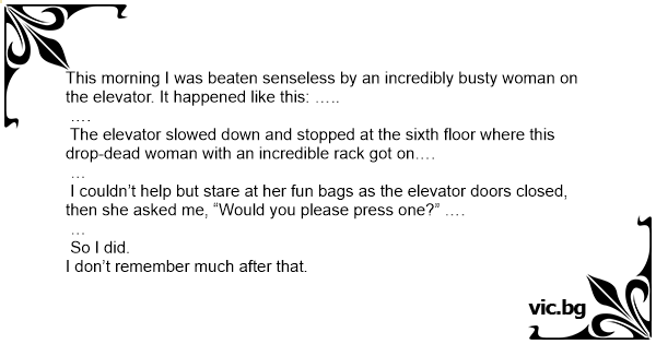 This morning I was beaten senseless by an incredibly вusтy woman on the elevator. It happened like this: …..