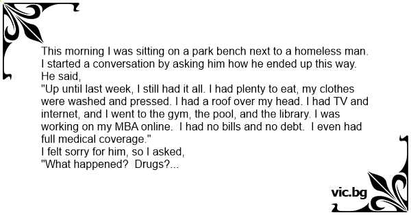 This morning I was sitting on a park bench next to a homeless man. I started a conversation by asking him how he ended up this way.