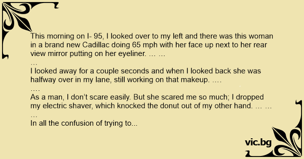 This morning on I- 95, I looked over to my left and there was this woman in a brand new Cadillac doing 65 mph with her face up next to her rear view mirror putting on her eyeliner. … …