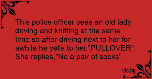This police officer sees an old lady driving and knitting at the same time so after driving next to her for awhile he yells to her,"PULLOVER". She replies,"No a pair of socks".