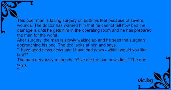 After surgery, the man is slowly waking up and he sees the surgeon approaching his bed. The doc looks at him and says,