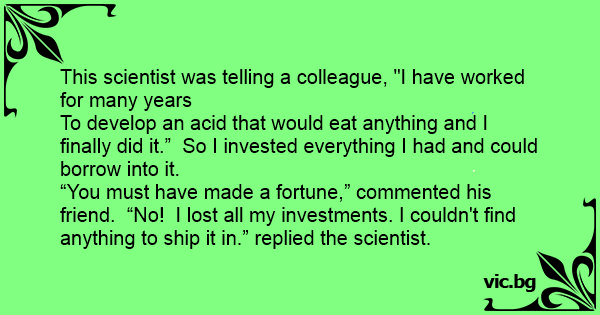 “You must have made a fortune,” commented his friend. “No! I lost all my investments. I couldn't find anything to ship it in.” replied the scientist.