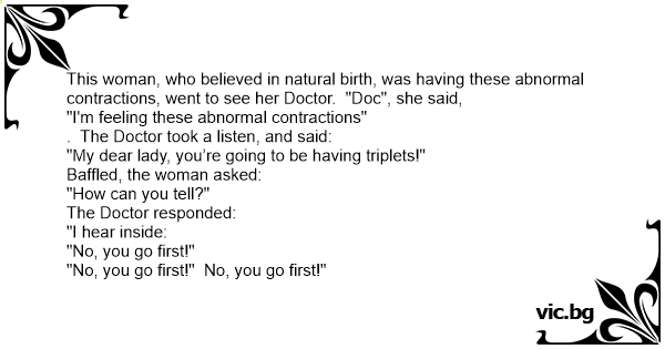 This woman, who believed in natural birth, was having these abnormal contractions, went to see her Doctor. "Doc", she said,