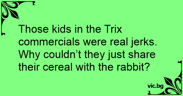 Those kids in the Trix commercials were real jerks. Why couldn’t they just share their cereal with the rabbit?
