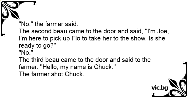 The third beau came to the door and said to the farmer. ''Hello, my name is Chuck.''