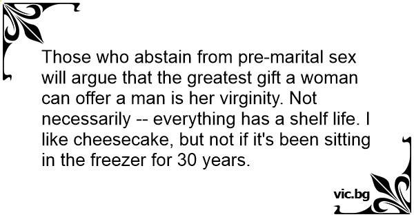 Those who abstain from pre-marital sеx will argue that the greatest gift a woman can offer a man is her virginity. Not necessarily -- everything has a shelf life. I like cheesecake, but not if it's been sitting in the freezer for 30 years.