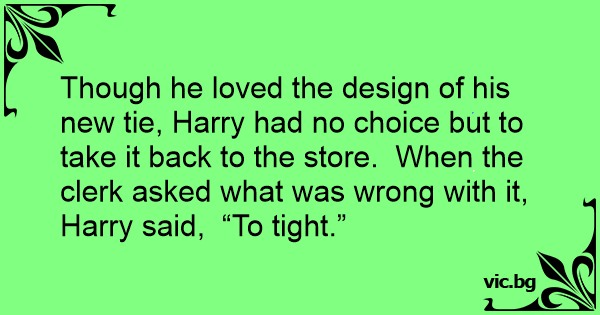 Though he loved the design of his new tie, Harry had no choice but to take it back to the store. When the clerk asked what was wrong with it, Harry said, “To tight.”