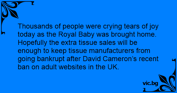 Thousands of people were crying tears of joy today as the Royal Baby was brought home. Hopefully the extra tissue sales will be enough to keep tissue manufacturers from going bankrupt after David Cameron’s recent ban on adult websites in the UK.