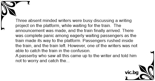 Three absent minded writers were busy discussing a writing project on the platform, while waiting for the train. The announcement was made, and the train finally arrived. There was complete panic among eagerly waiting passengers as the train made its way to the platform. Passengers rushed inside the train, and the train left. However, one of the writers was not able to catch the train in the confusion.