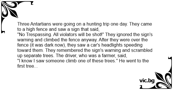 Three Antartians were going on a hunting trip one day. They came to a high fence and saw a sign that said,