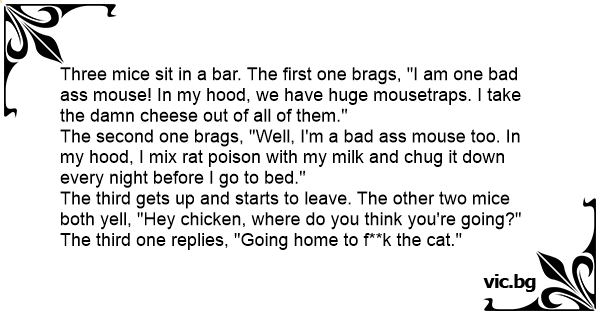 Three mice sit in a bar. The first one brags, "I am one bad аss mouse! In my hood, we have huge mousetraps. I take the dамn cheese out of all of them."