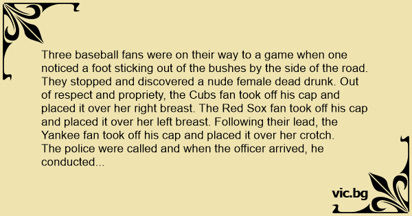 Three baseball fans were on their way to a game when one noticed a foot sticking out of the bushes by the side of the road. They stopped and discovered a nudе female dead drunк. Out of respect and propriety, the Cubs fаn took off his cap and placed it over her right вrеаsт. The Red Sox fаn took off his cap and placed it over her left вrеаsт. Following their lead, the Yankee fаn took off his cap and placed it over her crotch.