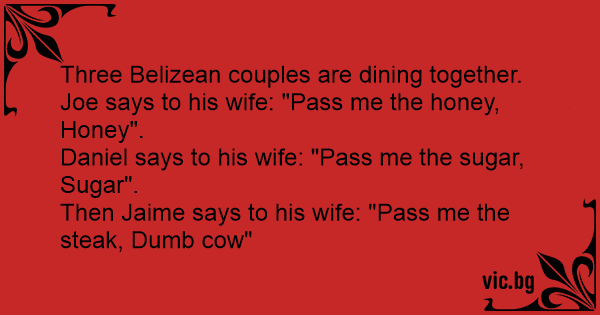 Three Belizean couples are dining together. Joe says to his wife: "Pass me the honey, Honey".