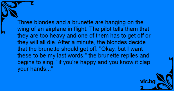 Three blondes and a brunette are hanging on the wing of an airplane in flight. The pilot tells them that they are too heavy and one of them has to get off or they will all die. After a minute, the blondes decide that the brunette should get off. "Okay, but I want these to be my last words," the brunette replies and begins to sing, "if you're happy and you know it clap your hands..."