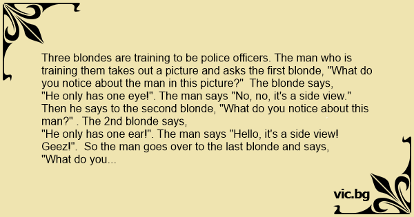 Three blondes are training to be police officers. The man who is training them takes out a picture and asks the first blonde, "What do you notice about the man in this picture?" The blonde says,