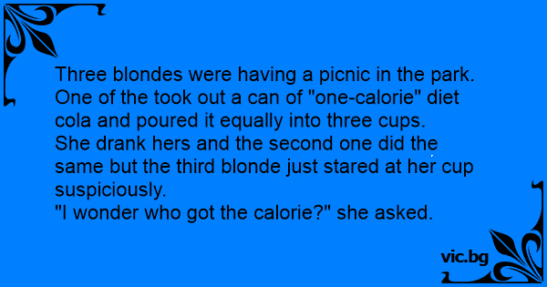 Three blondes were having a picnic in the park. One of the took out a can of "one-calorie" diet cola and poured it equally into three cups.