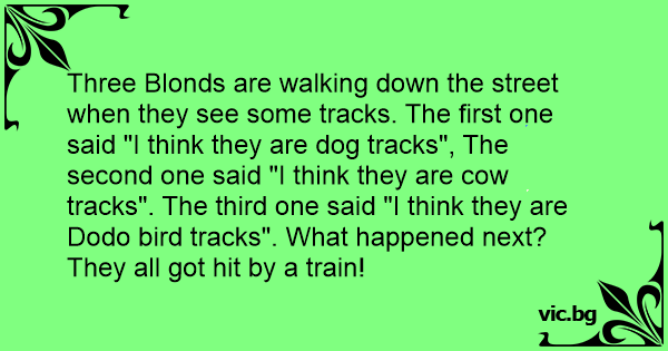 Three Blonds are walking down the street when they see some tracks. The first one said "I think they are dog tracks", The second one said "I think they are соw tracks". The third one said "I think they are Dodo bird tracks". What happened next? They all got hit by a train!