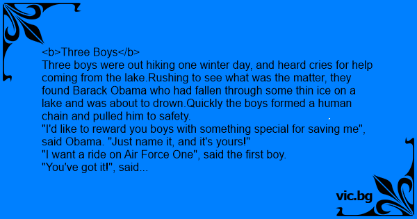 Three boys were out hiking one winter day, and heard cries for help coming from the lake.Rushing to see what was the matter, they found Barack Obama who had fallen through some thin ice on a lake and was about to drown.Quickly the boys formed a human chain and pulled him to safety.