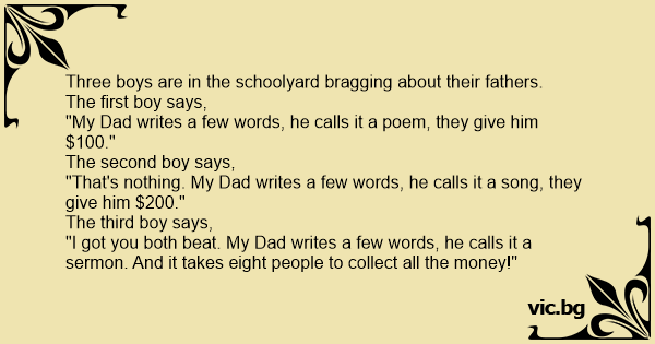 "I got you both beat. My Dad writes a few words, he calls it a sermon. And it takes eight people to collect all the money!"