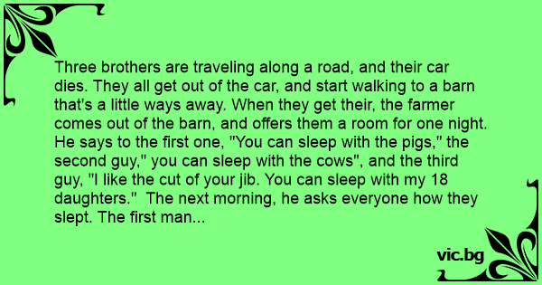 Three brothers are traveling along a road, and their car dies. They all get out of the car, and start walking to a barn that's a little ways away. When they get their, the farmer comes out of the barn, and offers them a room for one night. He says to the first one, "You can sleep with the pigs," the second guy," you can sleep with the cows", and the third guy, "I like the cut of your jib. You can sleep with my 18 daughters." The next morning, he asks everyone how they slept. The first man said,