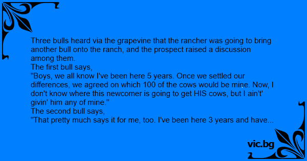 Three bulls heard via the grapevine that the rancher was going to bring another bull onto the ranch, and the prospect raised a discussion among them.