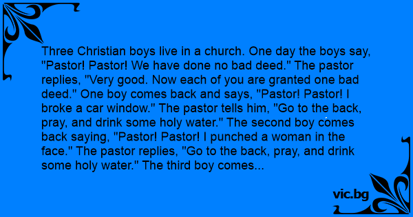 Three Christian boys live in a church. One day the boys say, "Pastor! Pastor! We have done no bad deed." The pastor replies, "Very good. Now each of you are granted one bad deed." One boy comes back and says, "Pastor! Pastor! I broke a car window." The pastor tells him, "Go to the back, pray, and drink some holy water." The second boy comes back saying, "Pastor! Pastor! I punched a woman in the face." The pastor replies, "Go to the back, pray, and drink some holy water." The third boy comes in and says, "Pastor! Pastor! I peed in the holy water!"