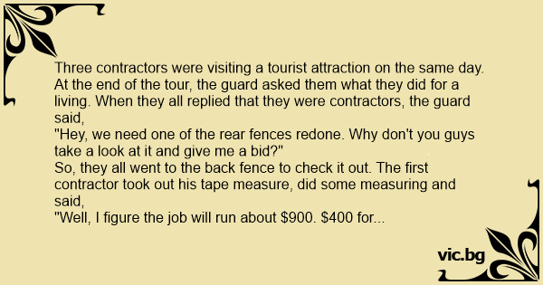 So, they all went to the back fence to check it out. The first contractor took out his tape measure, did some measuring and said,