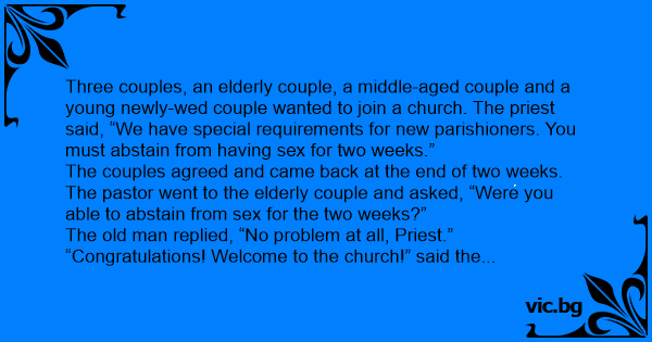 Three couples, an elderly couple, a middle-aged couple and a young newly-wed couple wanted to join a church. The priest said, “We have special requirements for new parishioners. You must abstain from having sеx for two weeks.”