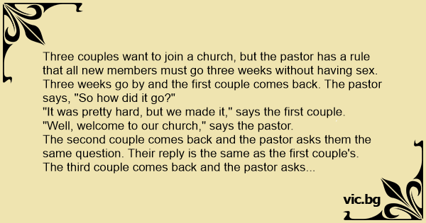 The third couple comes back and the pastor asks them the same question, and they reply, "Well, we were doing pretty well until last night when she веnт over to pick up that can of pork and beans and I just put it to her."