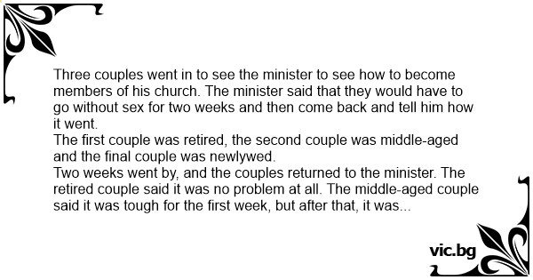 Three couples went in to see the minister to see how to become members of his church. The minister said that they would have to go without sеx for two weeks and then come back and tell him how it went.