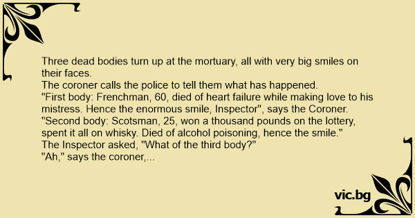 "First body: Frenchman, 60, died of heart failure while making love to his mistress. Hence the enormous smile, Inspector", says the Coroner.