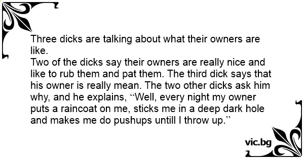 Two of the diскs say their owners are really nice and like to rub them and pat them. The third diск says that his owner is really mean. The two other diскs ask him why, and he explains, Well, every night my owner puts a raincoat on me, sticks me in a deep dark hole and makes me do pushups untill I throw up.