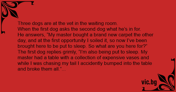 The first dog replies grimly, “I’m also being put to sleep. My master had a table with a collection of expensive vases and while I was chasing my tail I accidently bumped into the table and broke them all.”