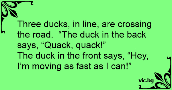 Three ducks, in line, are crossing the road. “The duck in the back says, “Quack, quack!”