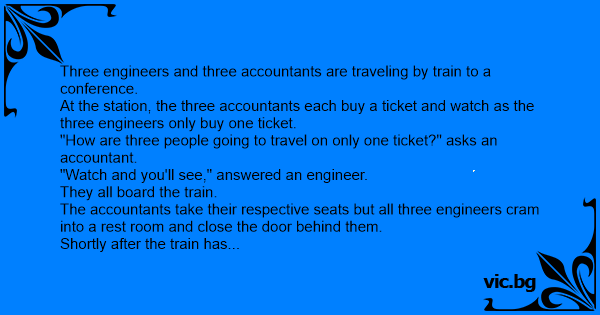 When they board the train all three accountants cram into a restroom and the three engineers cram into another one nearby.
