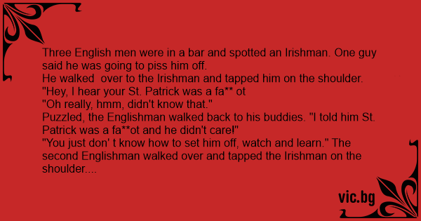 Седят си трима англичани в бара. По едно време виждат 1 ирландец. Единият казва: - Сега ще отида да му разкажа играта! Отива при ирландеца: - Знаеш ли, че вашия Свети Патрик е бил педераст! - Тъй ли? Не знаех... Връща се англичанинът учуден: - Този е...