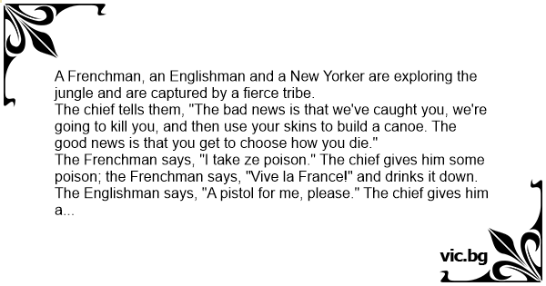 The Frenchman says, "I take ze poison." The chief gives him some poison; the Frenchman says, "Vive la France!" and drinks it down.