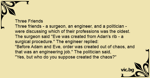 Three friends - a surgeon, an engineer, and a politician - were discussing which of their professions was the oldest. The surgeon said "Eve was created from Adan's rib - a surgical procedure." The engineer replied: