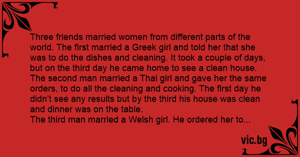 Three friends married women from different parts of the world. The first married a Greek girl and told her that she was to do the dishes and cleaning. It took a couple of days, but on the third day he came home to see a clean house.