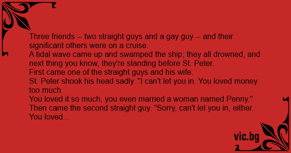 Three friends -- two straight guys and a gаy guy -- and their significant others were on a cruise.