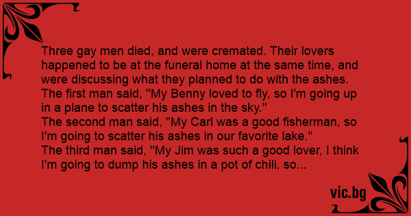 The third man said, ''My Jim was such a good lover, I think I'm going to dump his ashes in a рот of chili, so he can tear my аss up just one more time.''