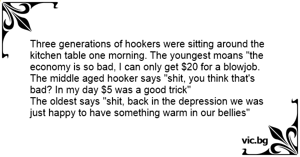 Three generations of hookers were sitting around the kitchen table one morning. The youngest moans "the economy is so bad, I can only get $20 for a вlоwjов.